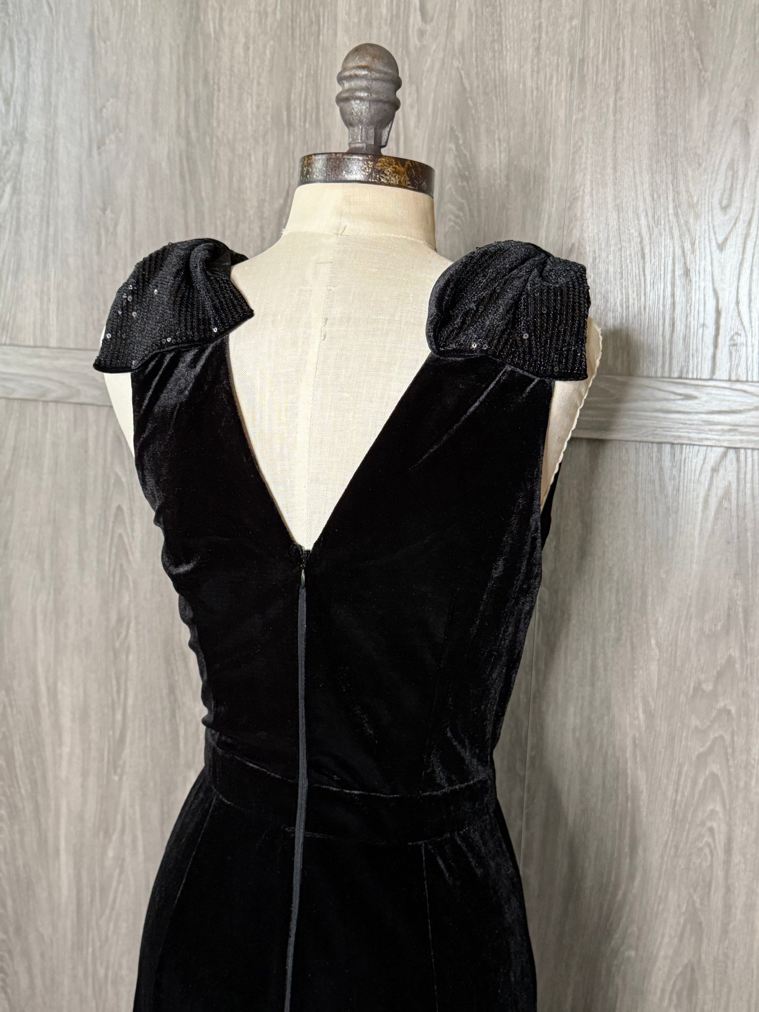 This velvet jumpsuit is perfect for any occasion with its elegant and sophisticated look. The added sequin bow accent adds a touch of glamour and makes it stand out from the rest. The soft and comfortable velvet material will make you feel luxurious while wearing it. A must-have piece for every fashion-forward individual.